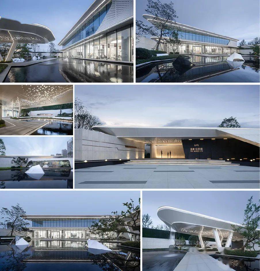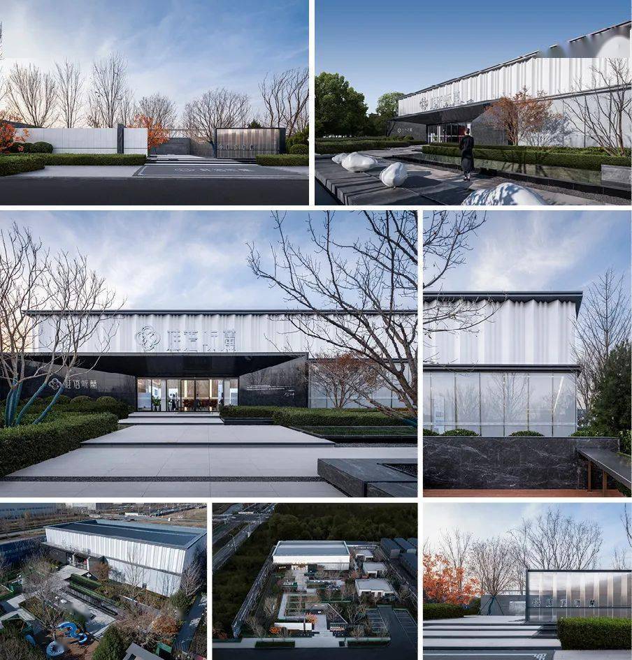 放眼于现代建筑,坚持“少即是多”的建设设计哲学,在处理手法上主张流动空间的概念,在设计中大量使用玻璃及铝板材质。通过现代极简的风格重塑了建筑师的思考和界定空间的方式。由现代极简建筑美学出发,在空灵透彻的极简玻璃盒子上增加悬挑檐增加水平分隔,细致刻画的铝板在保证流动空间的同时,平衡了玻璃的轻盈质感,使售楼处最终呈现出纯粹,简洁,精致,通透的视觉效果。