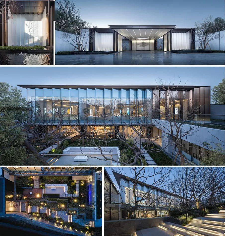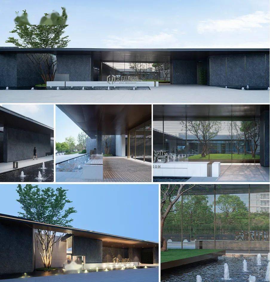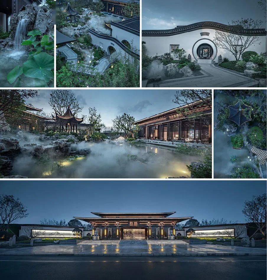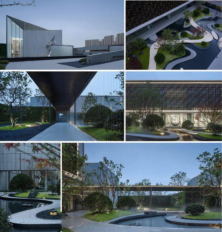 展示区师法江南山水园林造园精髓。建筑整体以一条中轴定鼎,序列严整,格局轩敞,数进门楼,内庭外院。其次,景观遵循道法自然的原则,局部景观采用蜿蜒曲折的造景手法,营造新中式庭院的雅致与尊贵。