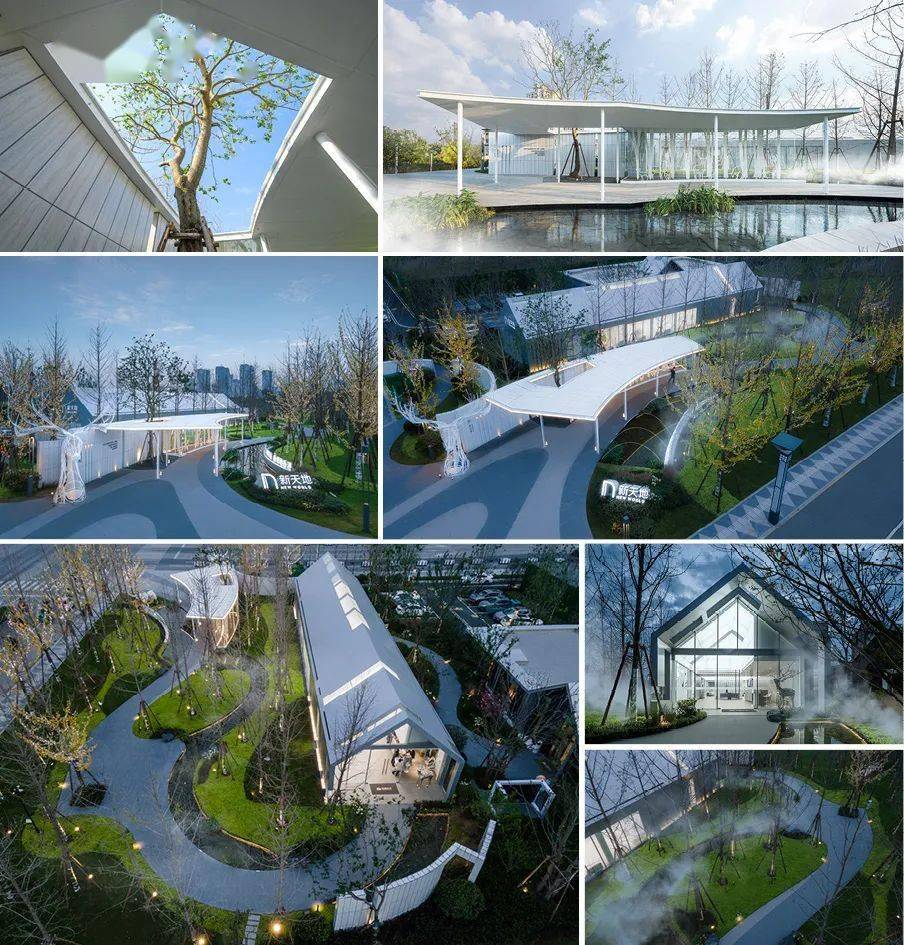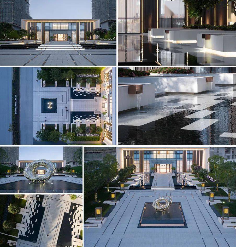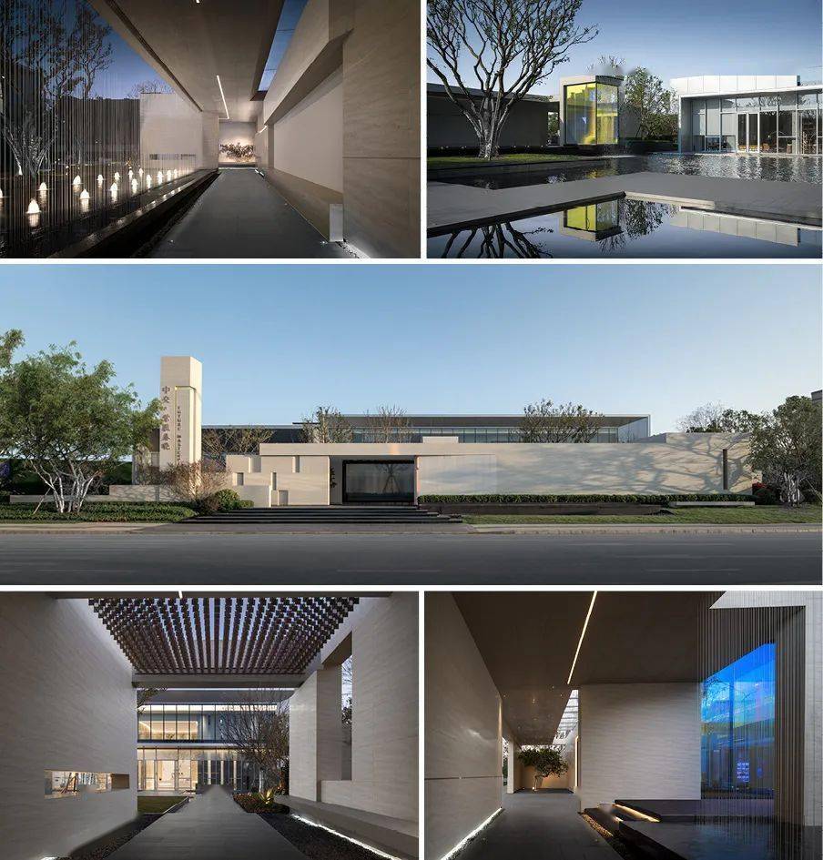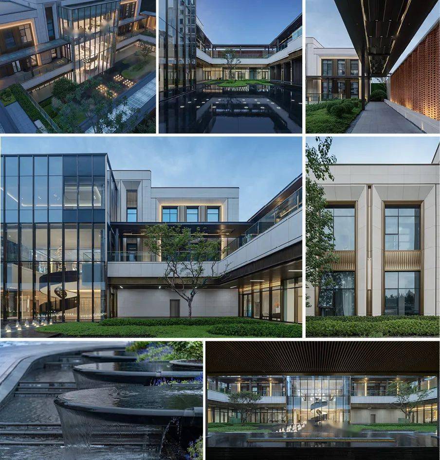 展示区师法江南山水园林造园精髓。建筑整体以一条中轴定鼎,序列严整,格局轩敞,数进门楼,内庭外院。其次,景观遵循道法自然的原则,局部景观采用蜿蜒曲折的造景手法,营造新中式庭院的雅致与尊贵。