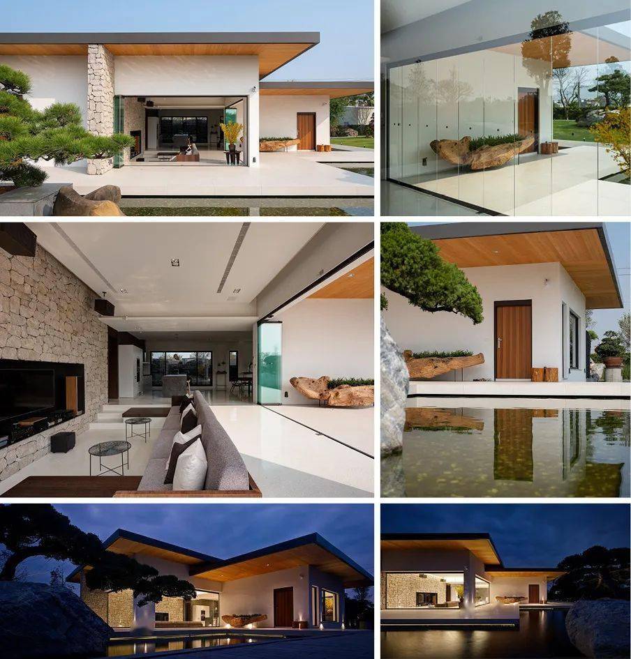 业主期望能将老家的农地设计规划成与家人好友聚会的私人空间,打造具备隐私并与自然绿意结合的建筑。基地的最外围种植2米高的树木,成为绿色的围墙,庭院种植各种树木及草皮形成自然生态,建物以水平高低交错的屋顶呈现简洁的意象, L型水池环绕,建物在水中的倒影产生层次感。