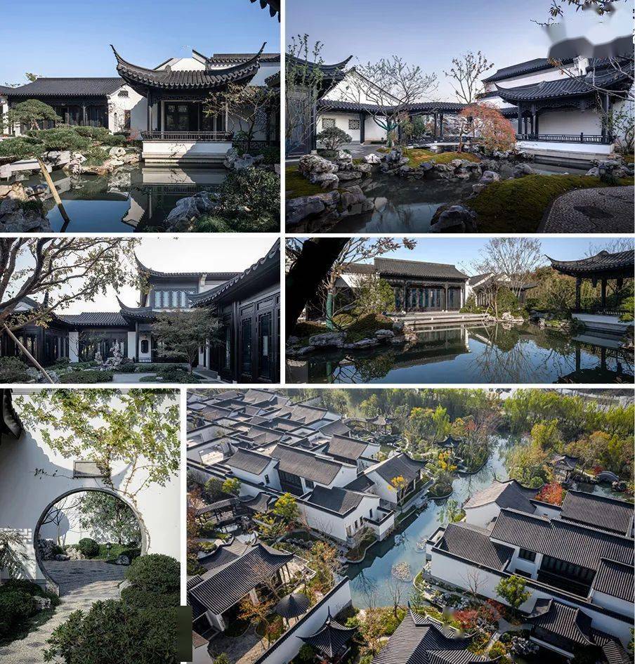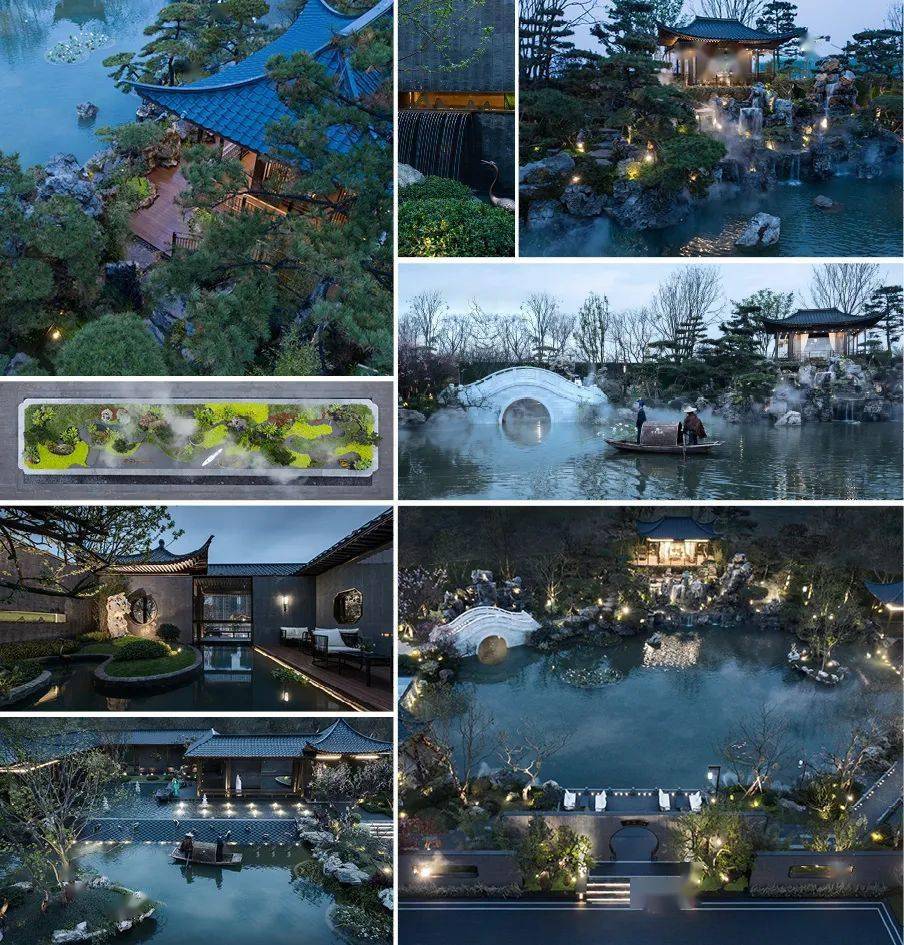 设计从沈周的渔乐图着手,以传统水乡生活画卷为引,以宅院巷街园演绎不同礼序,以传统中式造园手法打造现代理想居住空间。因地制宜,引水入园,打造多重水院景观。以山石、溪流、拱桥、松木、连廊为主要元素,沿袭中式风骨兼以现代化手法,描绘一处既可瞰远景,望乌水,又可栖水榭、嬉渔乐的水上桃源胜境。模仿乌镇水乡园林造园精髓,营造中式园林庭院氛围,重现小飞虹,并设码头连通景区,还原江南水乡生活场景。