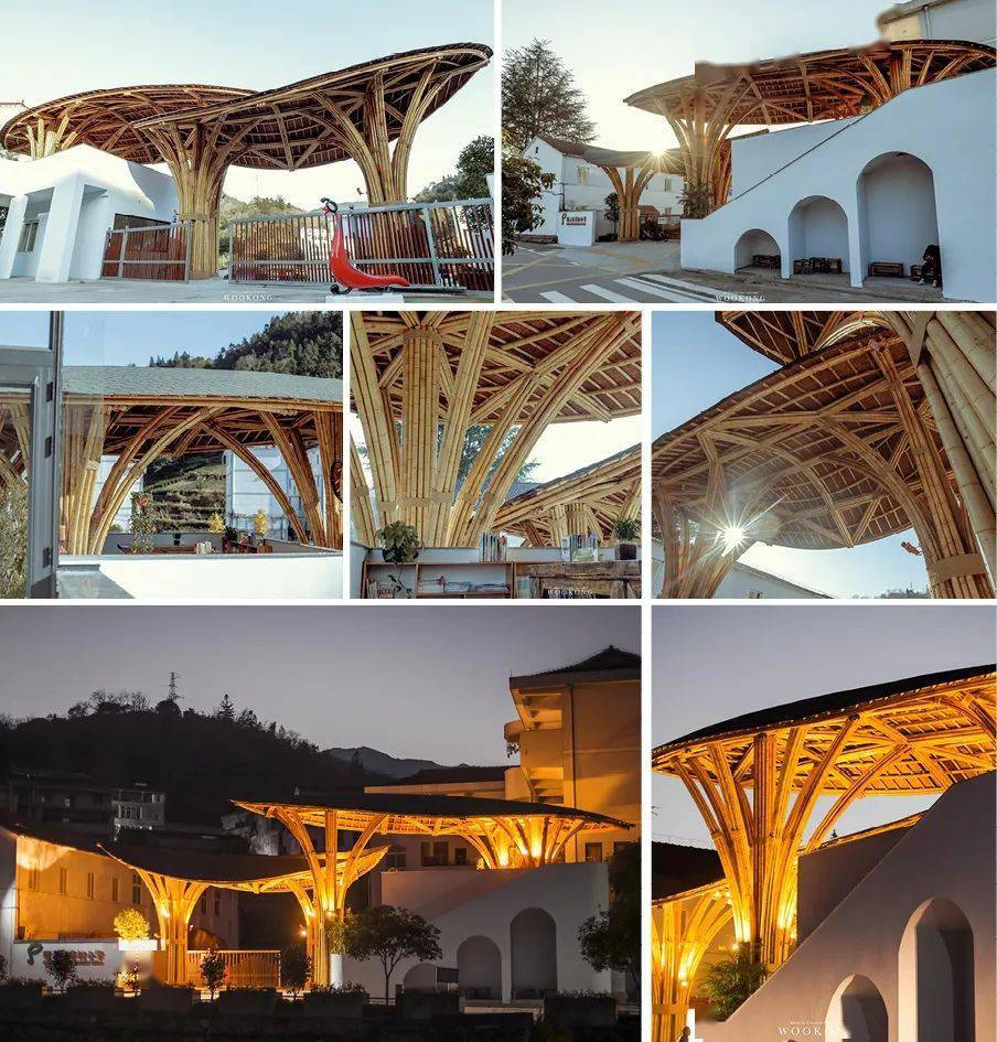 章村小学校门项目包含了校门构筑物,原有门卫及围墙改造。设计引入本地丰富的竹材,表现为漂浮在学校入口的两片“茶叶”,同时将门卫室的顶部改为露天茶亭,与学校的茶艺教室相连接,延展了茶艺课的教学实践空间。