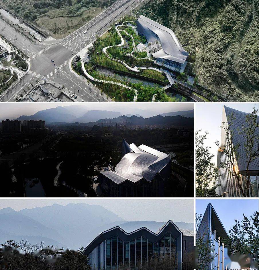 流动如水,起伏如山是整体建筑的设计概念。而屋顶做为本次设计的最大创意亮点,由三个不断变化的曲面构成,中部拱起形成眺望景观和展示内部的窗口,同时西侧幕墙净量做干净通透,可远观峨眉金顶。