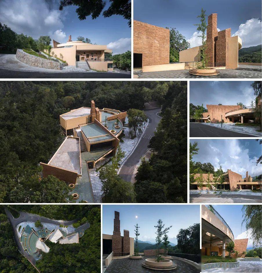 博物馆选址于景区内一座小山之南、市政道路之北的缓坡地。项目用地扁长,设计团队充分考虑了地形与山体的影响,首先将建筑整体划分为东西适度分离的结构,将内部用房置于用地西侧,而将博物馆置于基地东侧的道路转弯处,为了减少对转角处道路的压力,将博物馆主体建筑的平面设计成了弧形,这样会在道路拐角处自然形成缓冲空间,剖面则采用了层层叠退的形式。