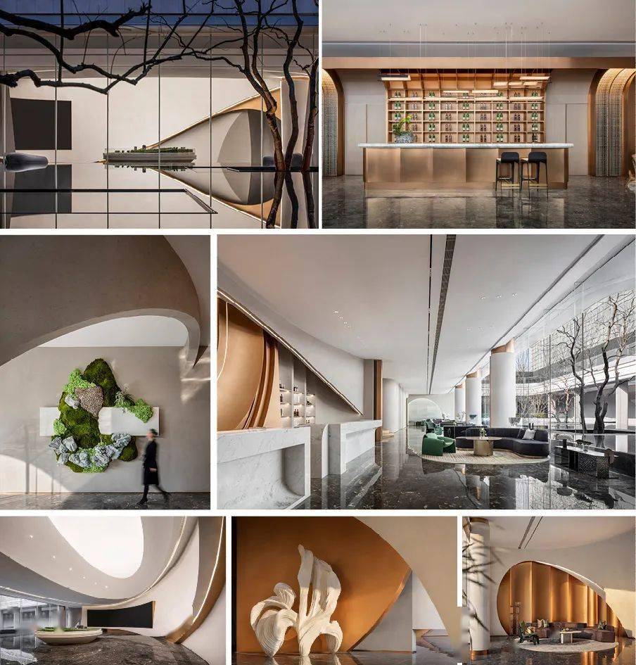 项目的特别之处皆在满足居住者不同维度的视觉审美,“俯瞰写意”、 “近观随形”、“礼遇铂悦”、“微光璞享”,通过流线设计、空间组合、工艺细节与灯光、植物搭配,营造铂悦系产品的定位。设计以景观面象征山岳、以楼宇象征城市,而人们就生活于其中,山、城、人——这亦是重庆当地的自然面貌。将山城文化融入自然,将自然之形提取凝练,揉入现代艺术元素作为设计语言,延续人与自然的和谐对线.