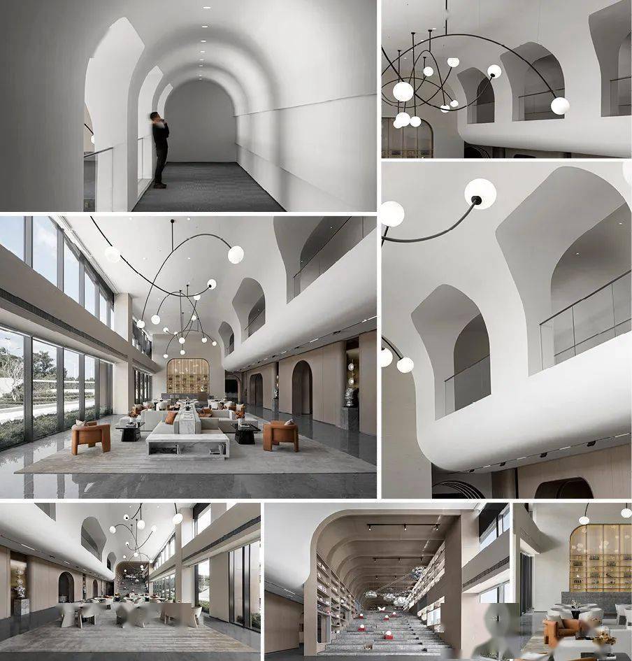 运用自然衍生曲线贯穿空间造型,以山势提神、山石点缀、山形塑形,运用材质精确划分与雅致的人为点缀体现山坚之品质。空间的视觉贯穿与景观的结合凸显与自然共生的艺术氛围。山丘艺术馆主体艺术装置还原光影带来的色彩呈现,由天井引入光线,并在旋转楼梯的衬托下贯穿于空间之中,如山涧流水散射落日余光,为空间带来第一抹色彩。