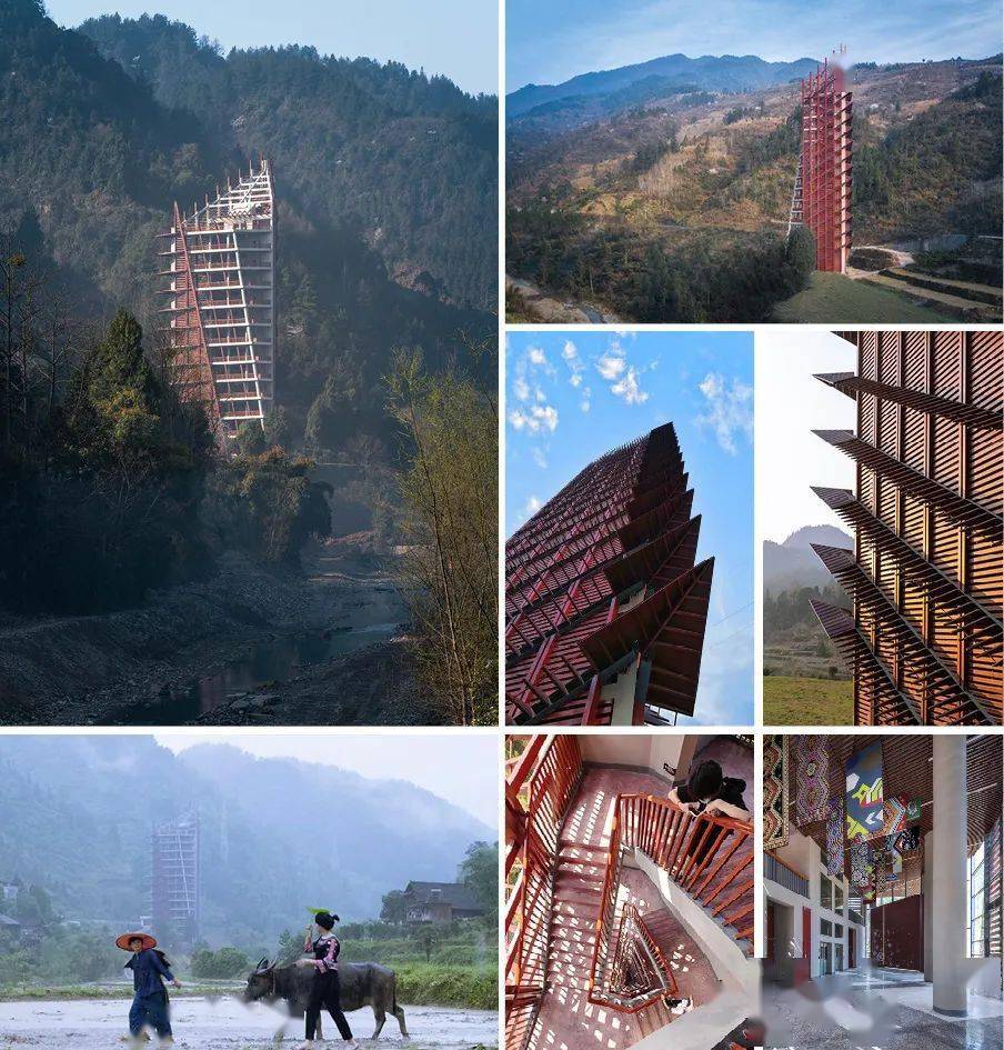 摩霄楼是中国土家族泛博物馆范围内的重要建筑,楼名取自土家族方言,有接近云天之意。祖祖辈辈在高山中生活的土家先民始终有天空情结,传统土家族曾建有层叠向上的冲天楼,但遗憾的是,目前既无实物可看,也无资料可考。我们设计的摩霄楼之形体由三棱柱为原型演化而来,设计强化塔楼的体量感和直上云霄的气势,为游客提供多层级、多角度的视觉体验。